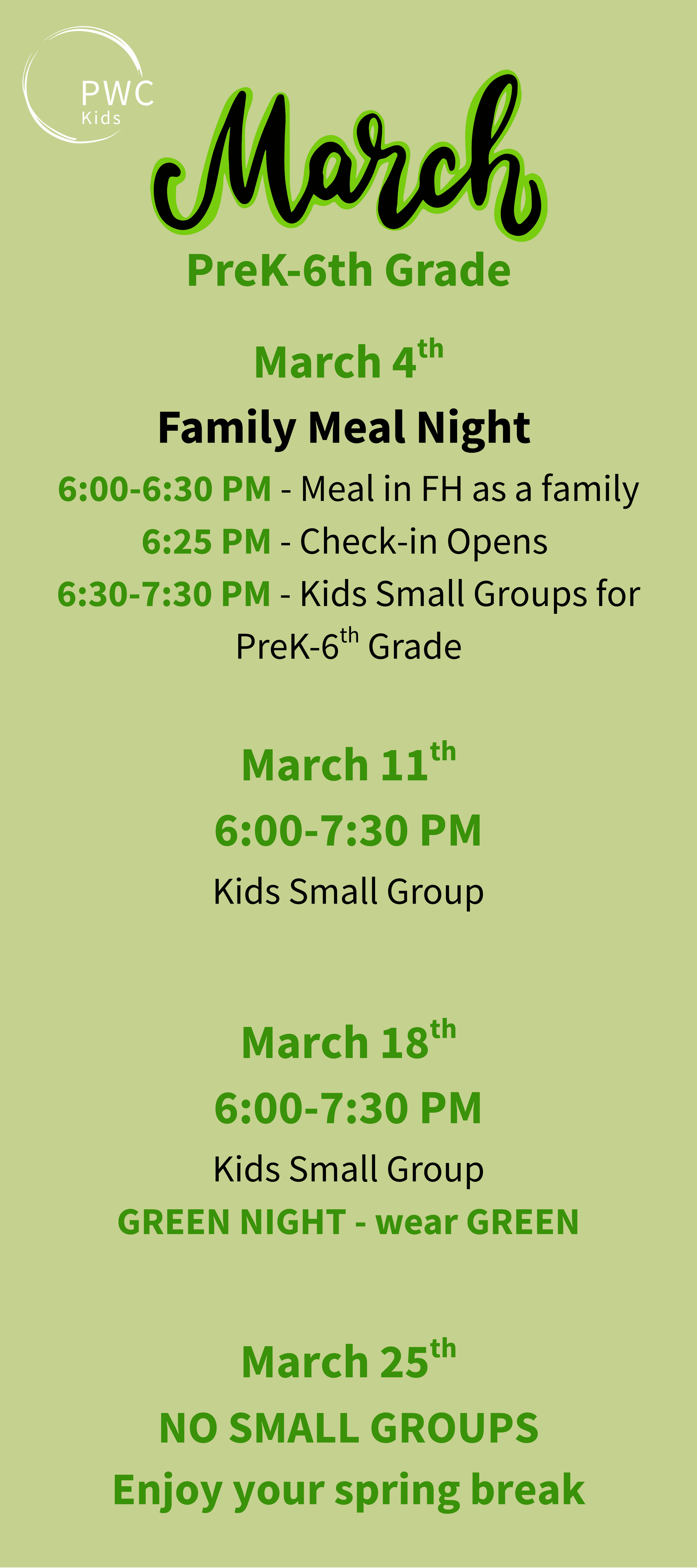 NO SMALL GROUPS - Enjoy your Spring Break